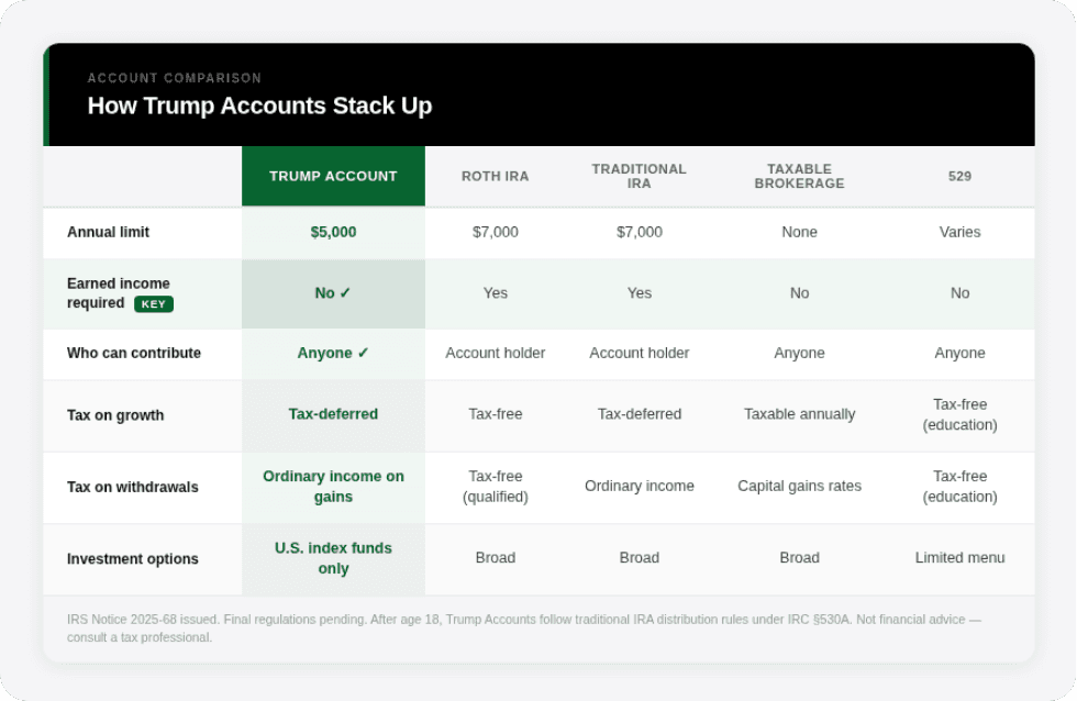 Trump Accounts aren’t a replacement for a Roth IRA, a 529, or a taxable brokerage. The investment menu is narrow. The tax treatment isn’t as clean.