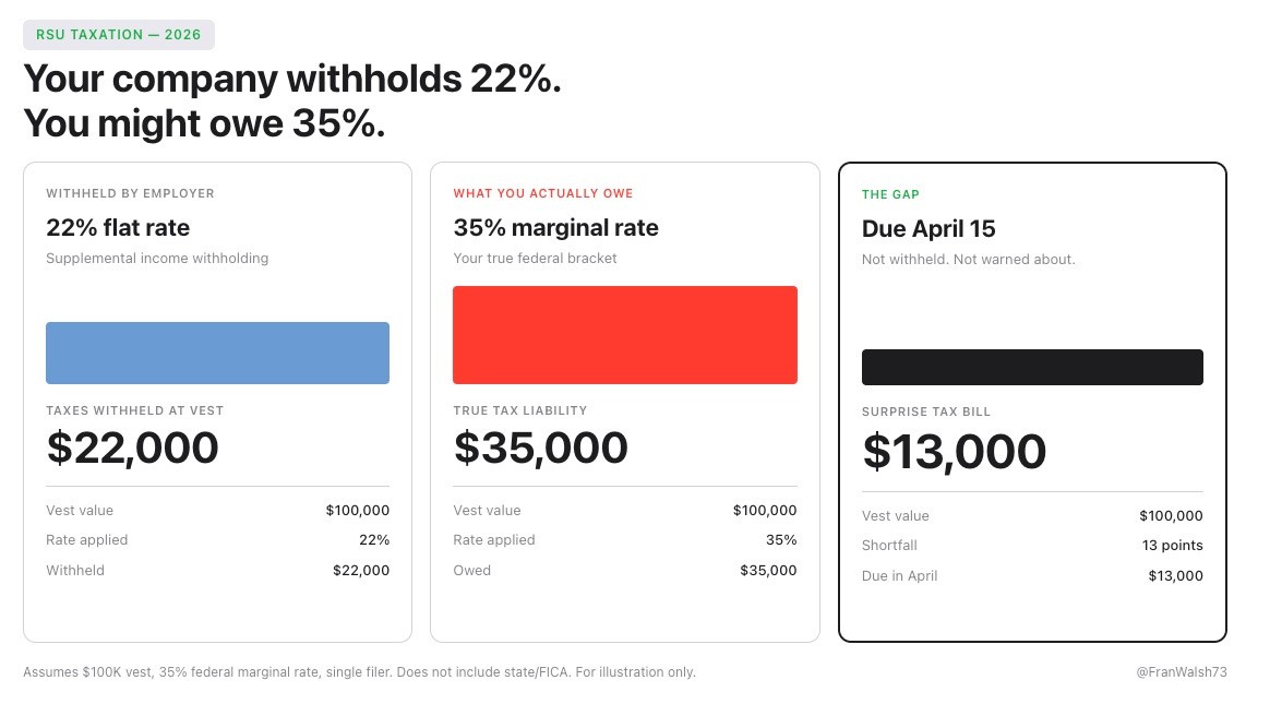 Your employer withholds 22%. If you’re in the 35% bracket, that gap on a $100,000 vest is $13,000 due in April.