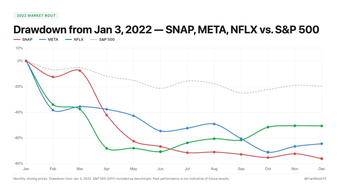 We saw exactly this in 2022. Meta, Snap, and Netflix all dropped 60-70% in a single year. Employees who had held their vested RSUs without diversifying didn’t just lose paper gains - they lost years of accumulated wealth. The people who had been systematically selling and diversifying at each vest were down with the broader market. Not down 60%.