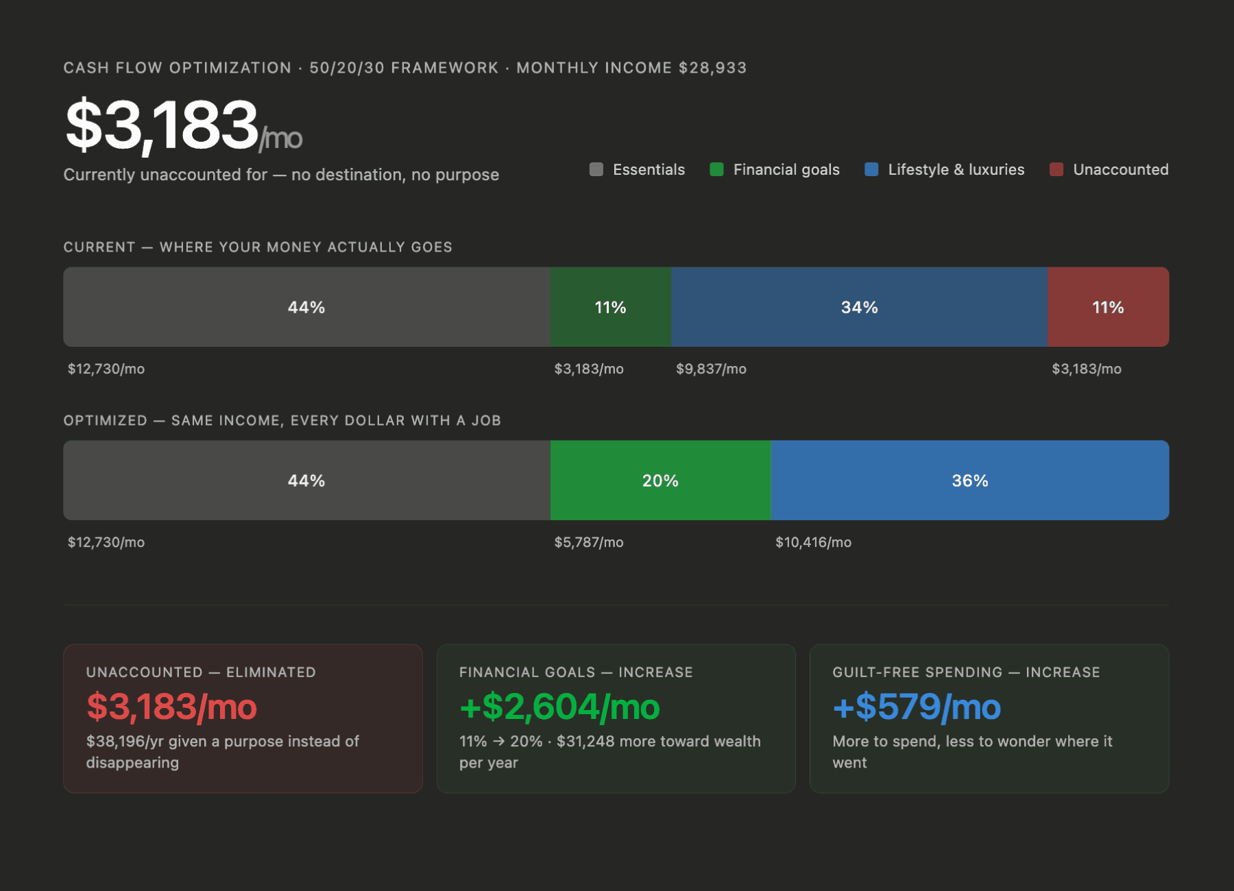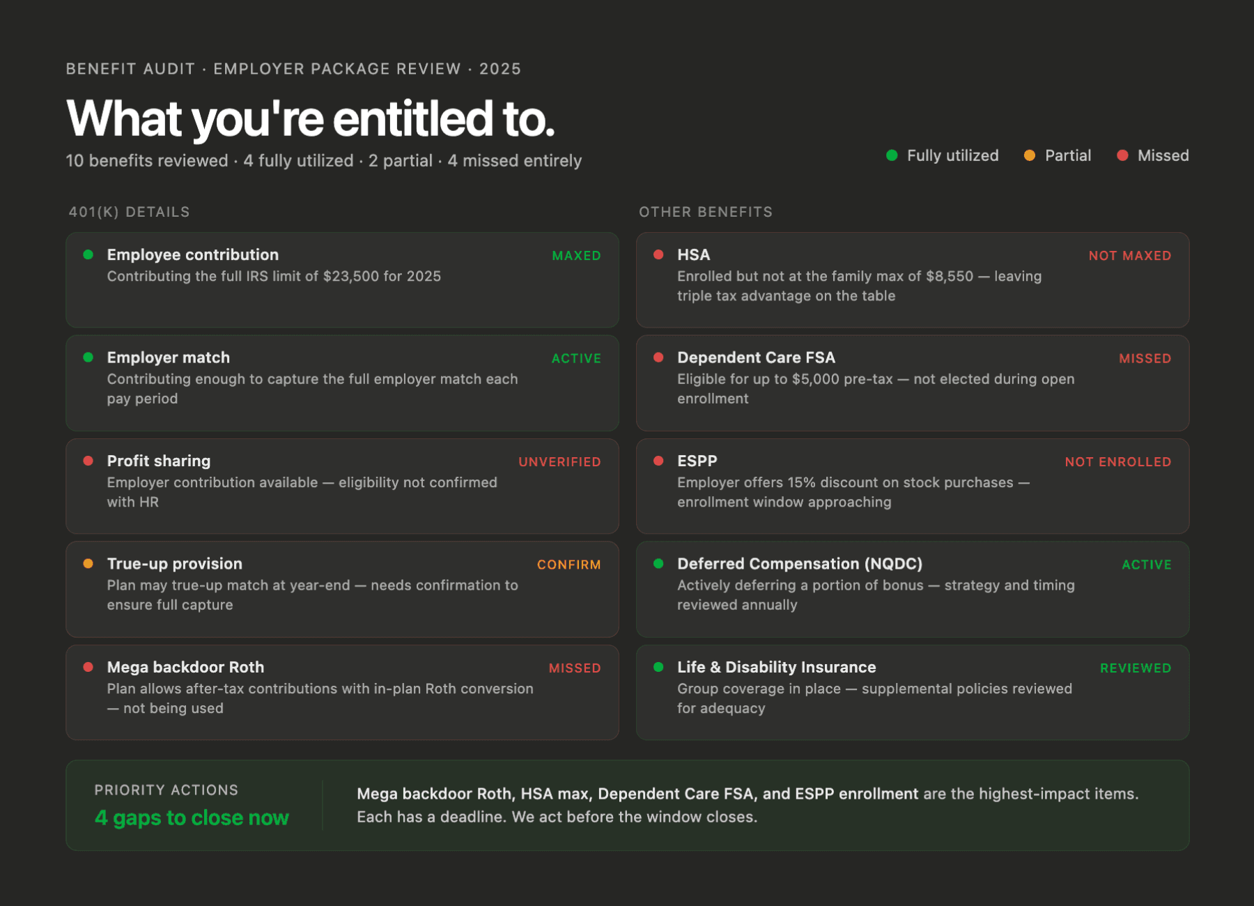 Some things move fast—cash flow, tax strategy, benefits gaps. Others build over time. By the end of your first year you'll have a full plan across all four pillars, proactive tax moves already made, and a clear picture of where you're headed.