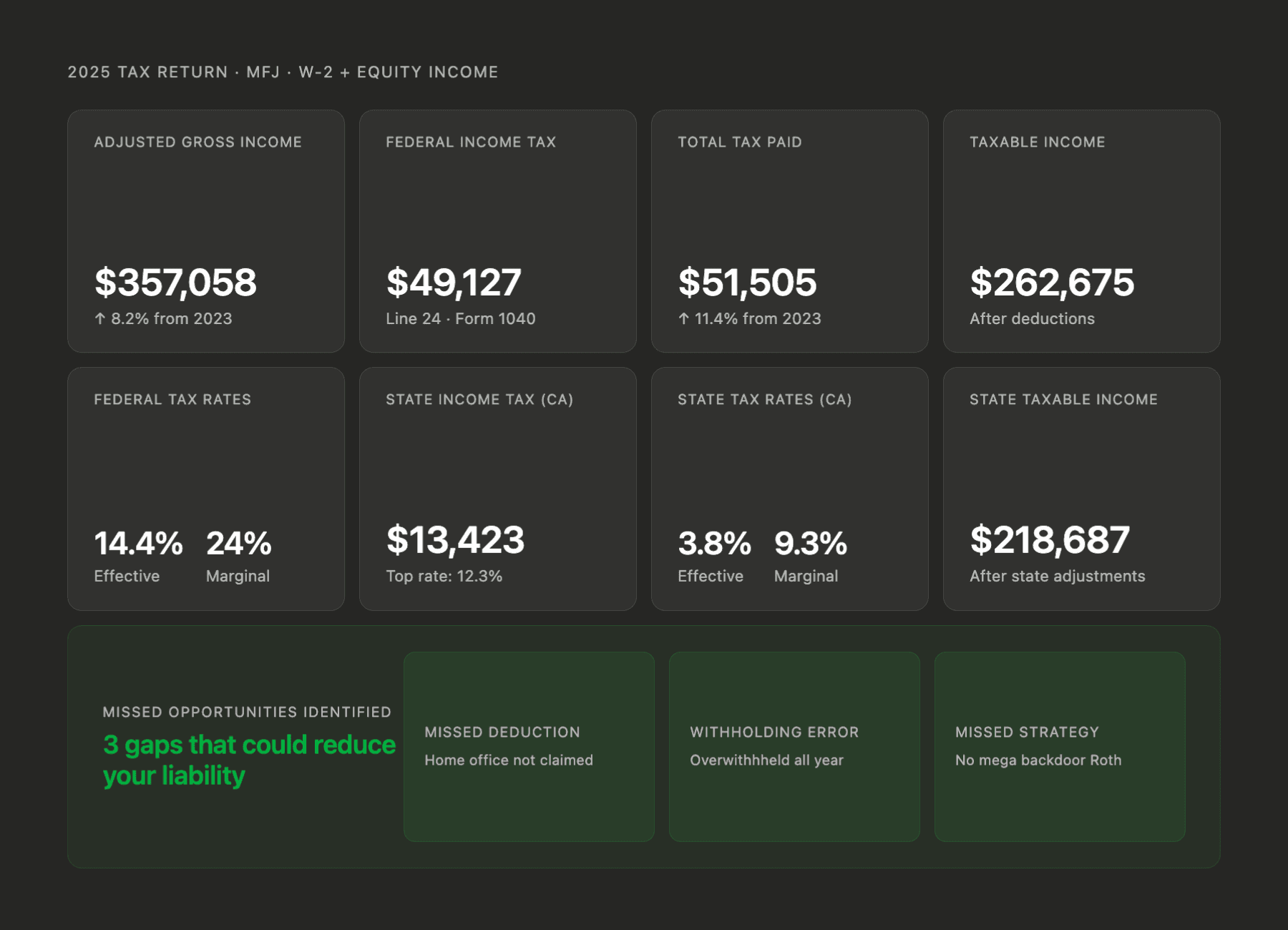 Most high earners overpay—not from carelessness, but because their tax strategy isn't connected to their income, investments, and equity comp. We fix that.