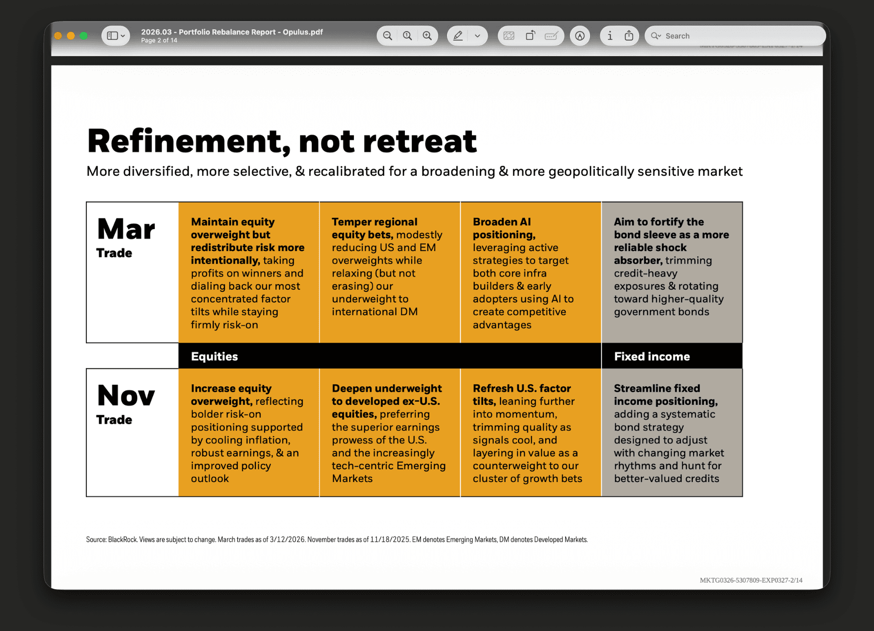 We build portfolios using BlackRock's Aladdin risk platform—the same institutional tools used by the world's largest asset managers. That means allocations across US, international, bonds, sectors, and alternatives based on research, not guesswork. We make adjustments 2-6 times a year, and every decision is tied to your personal tax strategy, not just market conditions.