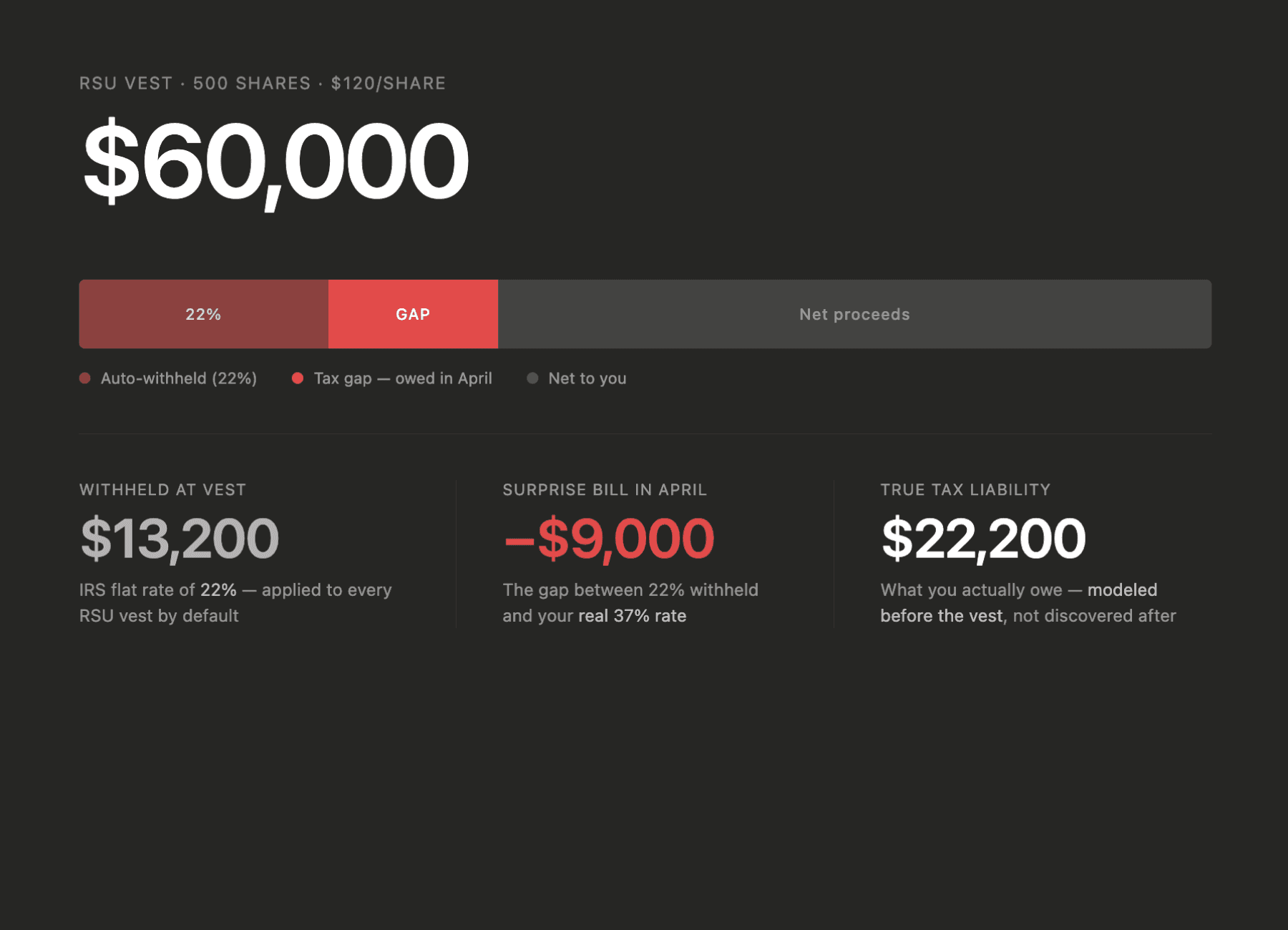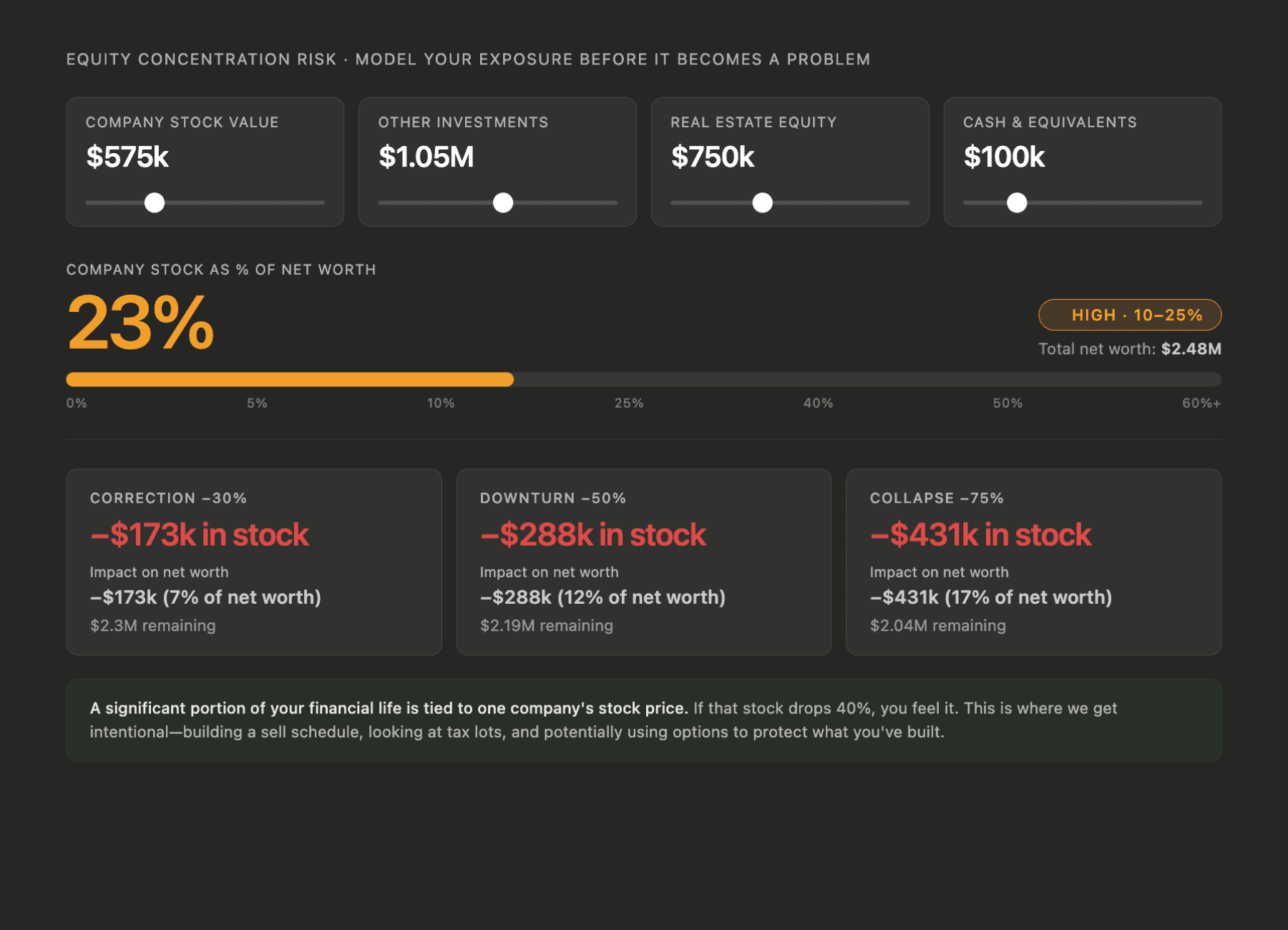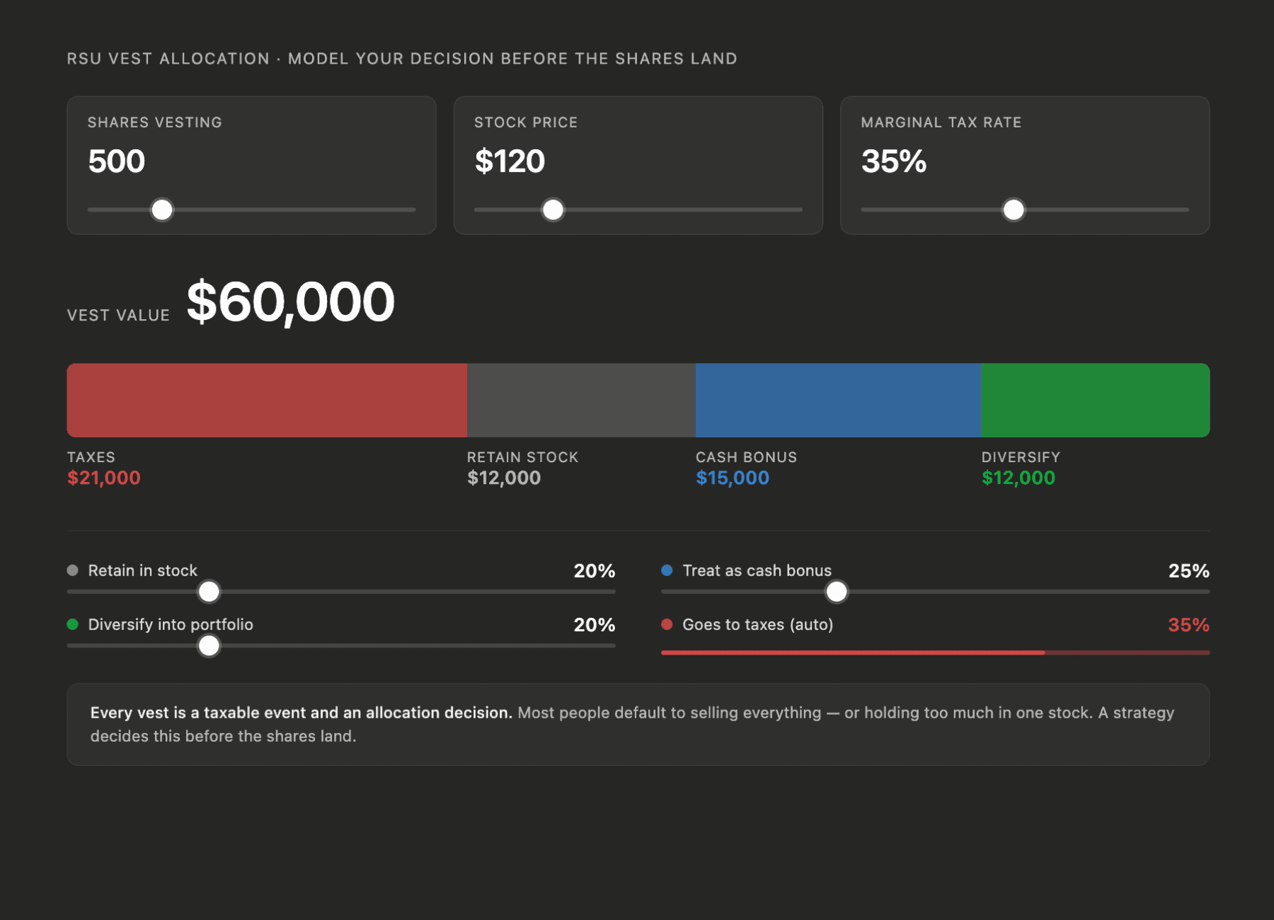RSUs, stock options, and ESPPs all come with timing decisions that have real tax consequences. We model the impact before you act—so you're not figuring it out at tax time when it's too late to change anything.